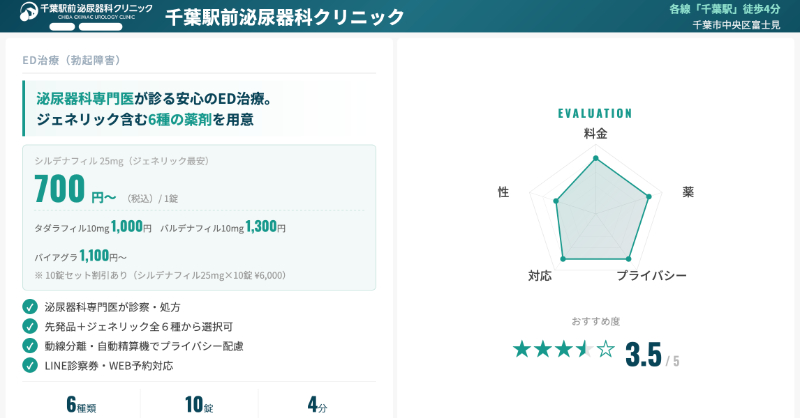 | 千葉駅前泌尿器科クリニック | 駅近で通いやすい、泌尿器科として安心感がある | 性感染症外来もあり、混み合う時間帯があるという声 |