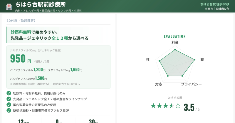 | 東京上野クリニック 千葉院 | 処方料 2,200円+薬代 | バイアグラ 1,980円(50mg)/シアリス 2,200〜2,310円/ジェネリックなど | 自費だが専門性・サポート重視の人向け |