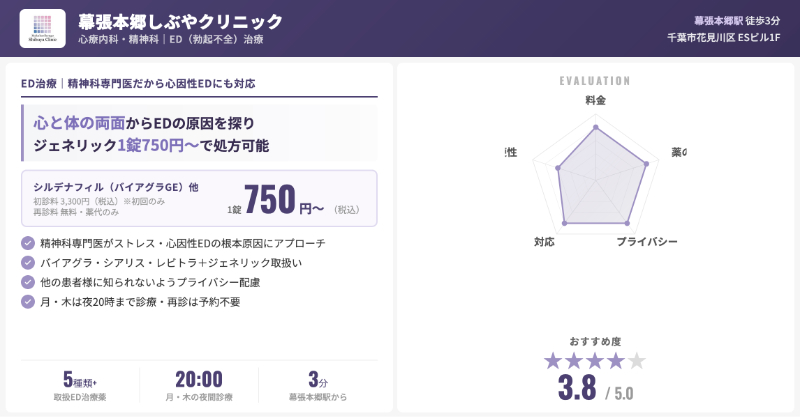 | 幕張本郷しぶやクリニック | 心療内科・精神科専門+ED(自費診療)、メンタル面のケアも可 | 心因性EDやストレスが心配な人 |