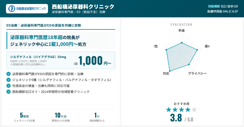 | イースト駅前クリニック 船橋院 | 診察料0円(薬代のみ) | 最安帯:ジェネリック 440円〜/シアリスジェネ20mg 1,400円など | 国内正規品・ED専門、コスパ重視に向く |