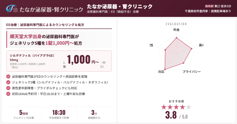 イースト駅前クリニック 船橋院や柏東医院は「診察料0円・薬代のみ」で始めやすく、バイアグラジェネリックやタダラフィルジェネリックなど比較的安価なED治療薬も用意されています。