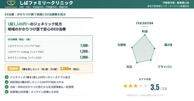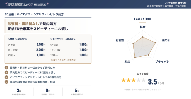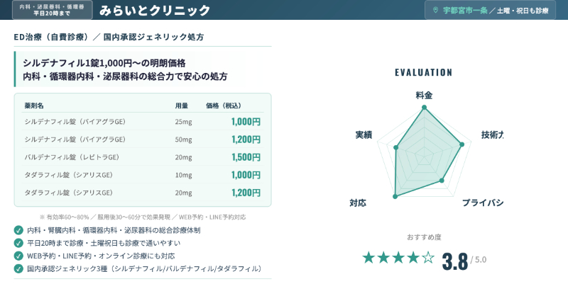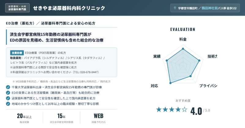 宇都宮竹内クリニック美容クリニック比較サイト などED含む男性施術での満足度が高く、評価は4点台が中心とされる。