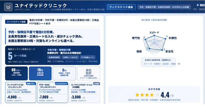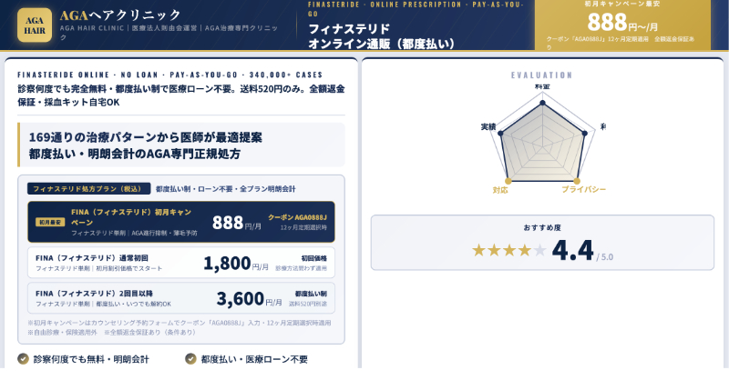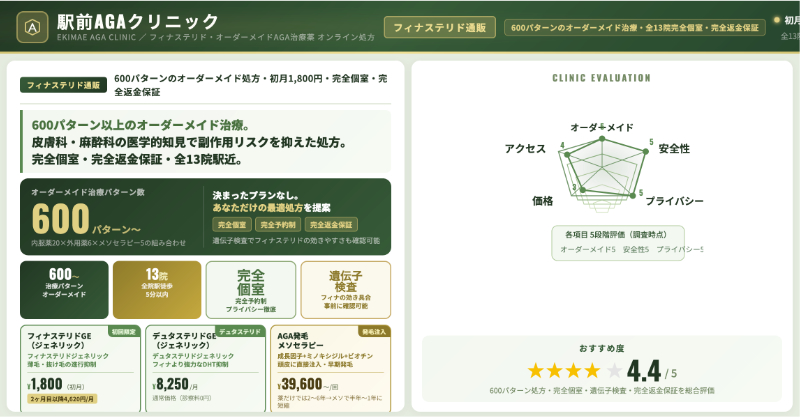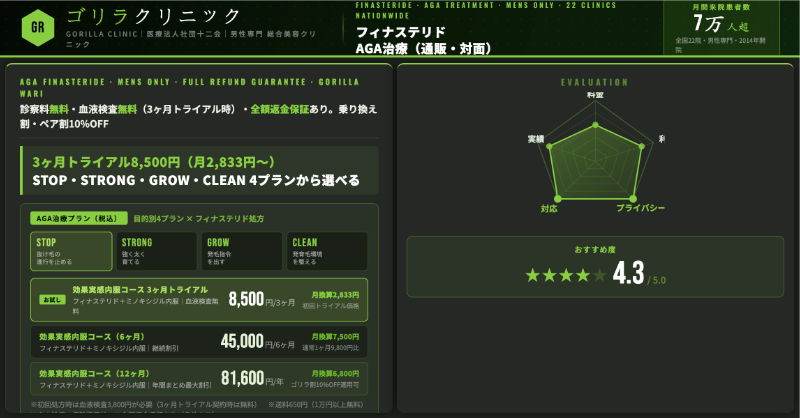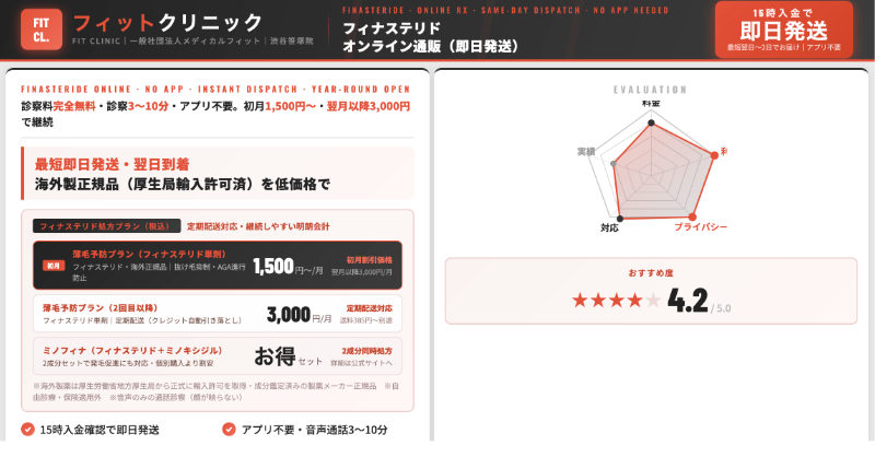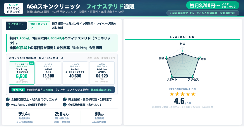 オンライン診療中心である以上、対面が必要な皮膚疾患や検査が必要なケースには向きませんが、スマホで手軽に診察を受け、定期便でフィナステリドを受け取りたい人にとっては、料金体系とプランの幅がバランスの取れたAGAオンラインクリニックといえるでしょう。