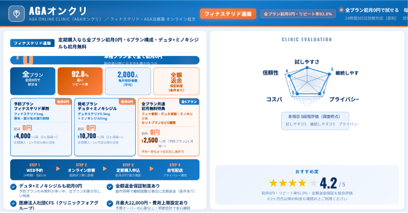 | AGAスマクリ | 定番発毛薬を初月無料+翌月から4,980円で提供するオンライン特化。 | 価格とシンプルさ重視の設計。 |