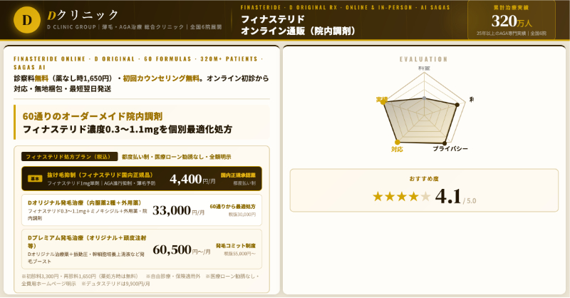 オンライン診療のAGAページでは、診療実績700万件以上・全国10院以上という規模を公表しており、フィナステリド通販・オンライン診療をできるだけ身近に、続けやすくする設計が特徴です。