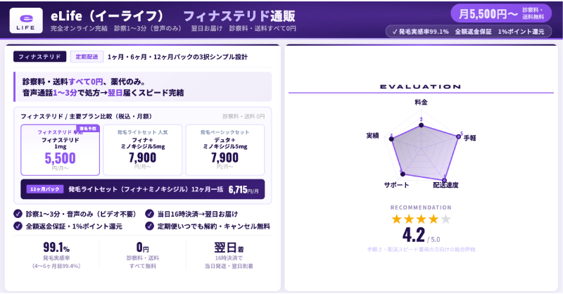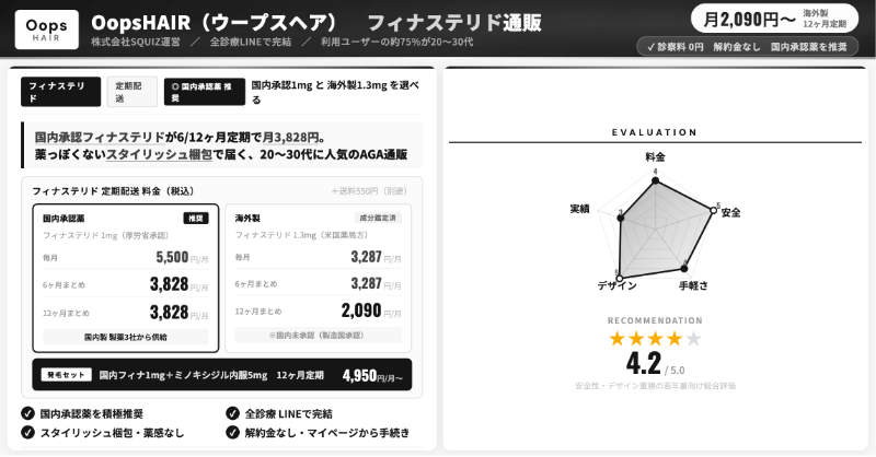 診察料は無料、配送料は全国一律550円(税込)の自由診療で、フィナステリド1mgを使う「予防プラン」は、らくらく定期便12ヶ月ごとで月2,097円(税込)〜と、公表されている料金の中でも抑えめの価格帯になります。
