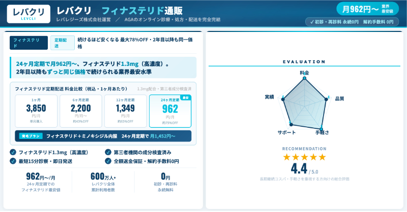 | レバクリ | フィナステリド育毛プラン(12か月定期) | 1,349円〜/月 | フィナ単剤では最安クラス。長期定期前提でコスパ重視なら有力。 |