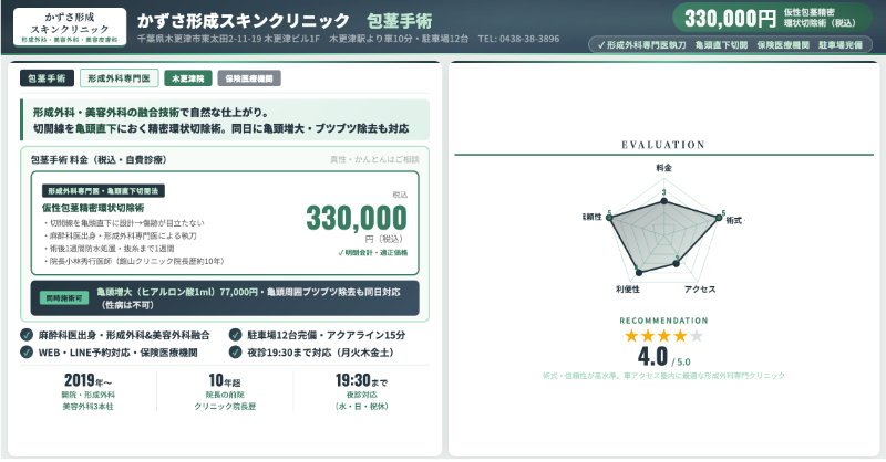 | 千葉中央美容形成クリニック | 仮性77,000円・カントン110,000~187,000円・真性143,000~220,000円 | 症状ごとに細かく料金が設定された美容外科型 |