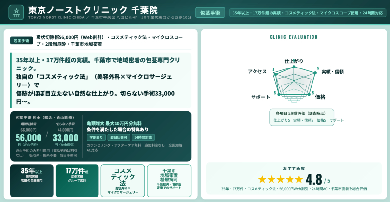 東京上野クリニックは創業34年・累計来院者35万人以上とされる長年の実績があり、千葉医院もそのネットワークの一院として包茎治療を行っています。東京ノーストクリニックも開院35年の歴史があり、包茎専門ドクターによる24時間バックアップ体制を打ち出しています。