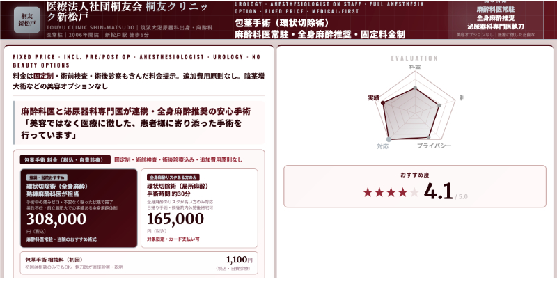 仕上がりの見た目を徹底的に追求したい人は東京上野クリニックやメンズライフクリニック、全身状態も含めた医療的な安心感を優先したい人は千葉駅前泌尿器科クリニックやたかす腎・泌尿器クリニックといった一般の泌尿器科を候補に入れると、バランスよく比較できるでしょう。