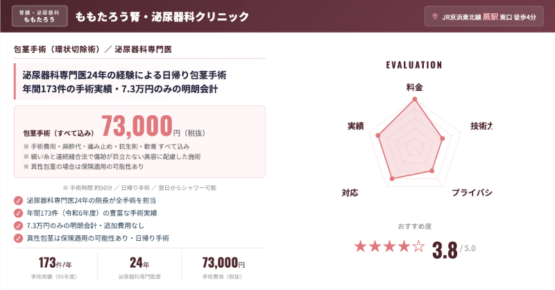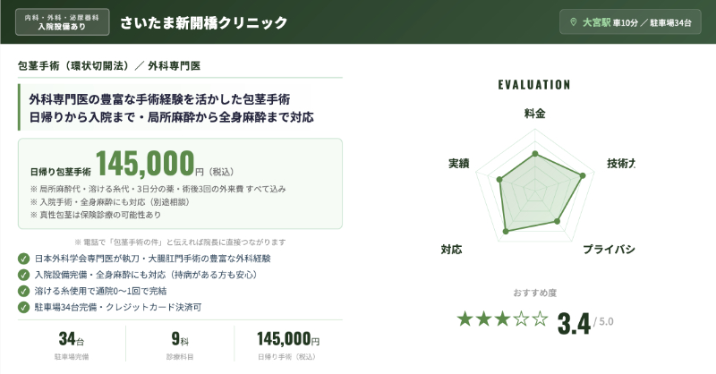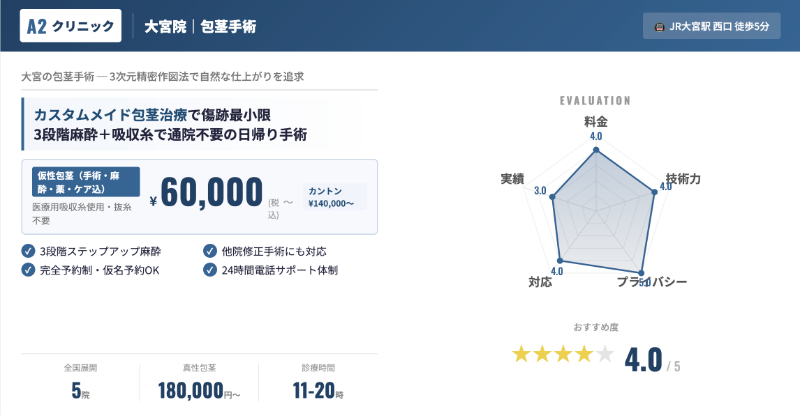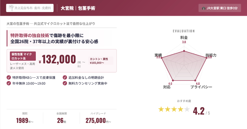 | 大宮中央クリニック | 仮性包茎 55,000円、真性・カントン包茎 132,000〜220,000円 | 美容包茎手術を中心に、状態別料金を公開 |