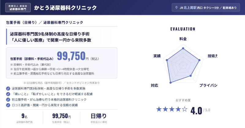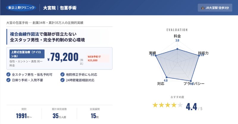 | 上野クリニック 大宮院 | 包茎専門の安心感、プライバシー配慮、アフターケアが手厚い |