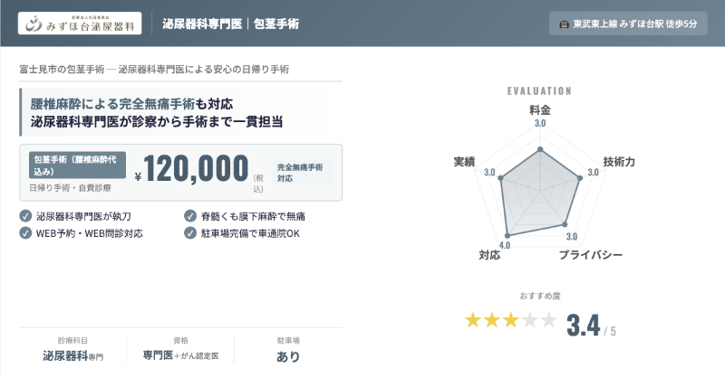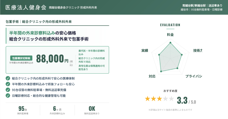 | フェアクリニック川口 | 仮性包茎 99,000円〜、真性包茎〜198,000円 | 形成外科の視点から細かなメニュー設定 |