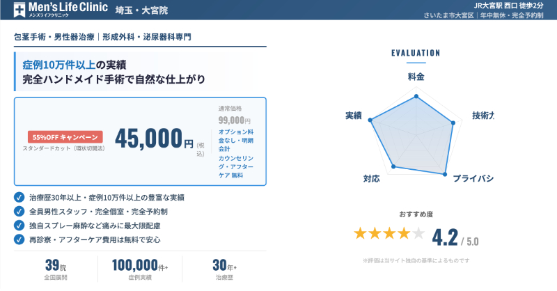 大宮エリアの包茎手術クリニックをまとめた比較サイトでは、ABCクリニック大宮院は料金が明朗で男性スタッフのみなので相談しやすい、メンズライフクリニック埼玉・大宮院はオールハンド治療で仕上がりが自然という声が目立ちます。