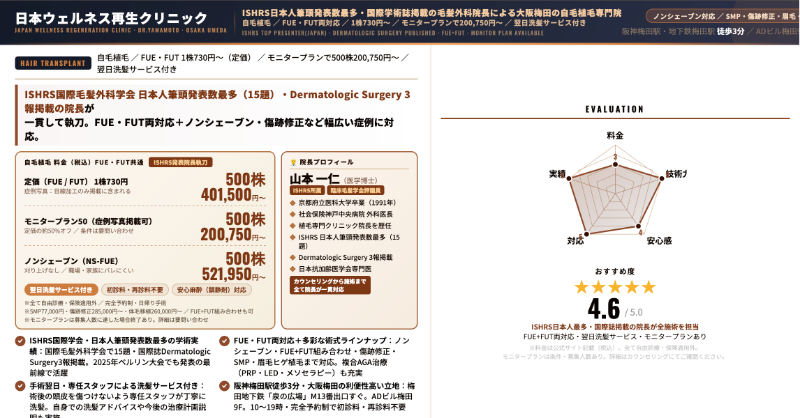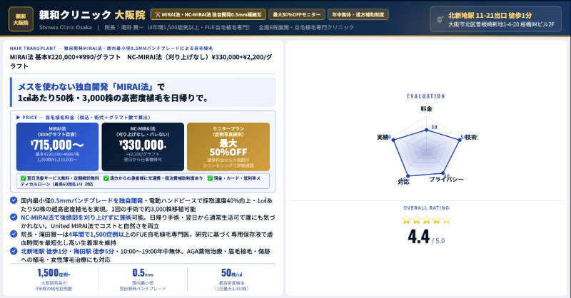 一方、ノンシェーブンで目立ちにくく、専門クリニックで受けたい場合は、親和クリニック大阪院のNC-MIRAI法やアイランドタワークリニック大阪院のU-Directも視野に入れて比較するとよいでしょう。