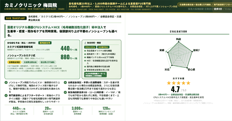 カミノクリニック 梅田院|高密度FUEを業界水準の安さで受けられる自毛植毛クリニック
