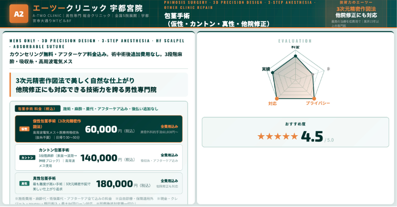 | エーツークリニック 宇都宮院 | 仮性包茎 60,000円/カントン 140,000円/真性 180,000円 | 公式に切らないメニュー掲載なし | 仮性6万円〜と明快。麻酔やアフター込みで追加なし。 |