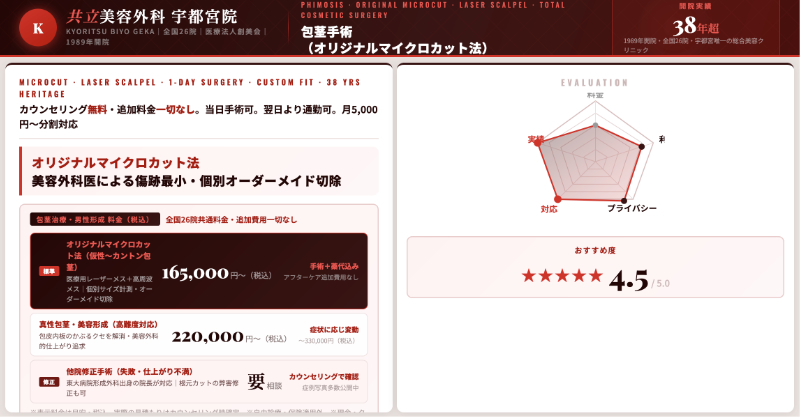 | 共立美容外科 宇都宮院 | 包茎治療 165,000〜330,000円 | 切らない治療は公式にはナシ | 大手美容外科としては標準〜やや高めのレンジ。 |