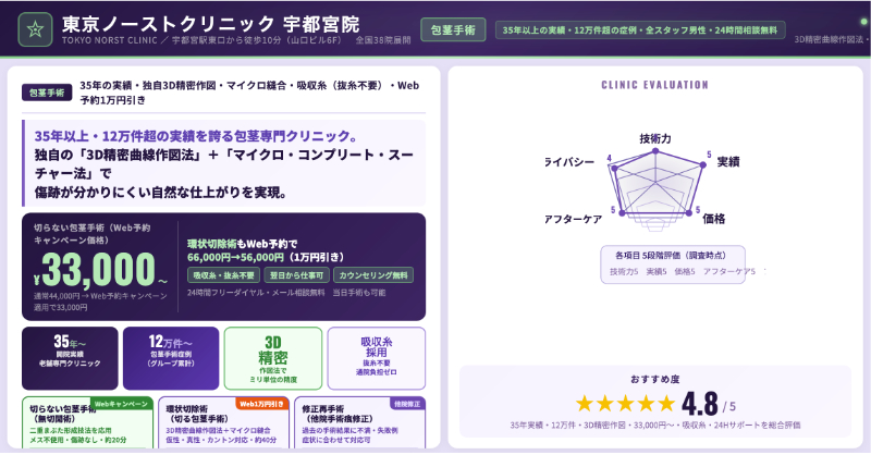 | 東京ノーストクリニック 宇都宮院 | 35年以上の包茎専門グループの一院。環状切開+美容形成、切らない手術までラインアップ。 |