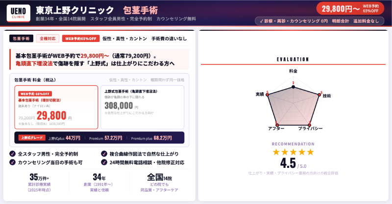 | 仕上がり | 亀頭直下法で目立ちにくい | 完全ハンドメイド/自然な縫合 | 亀頭直下+美容外科的縫合で自然な仕上がり |