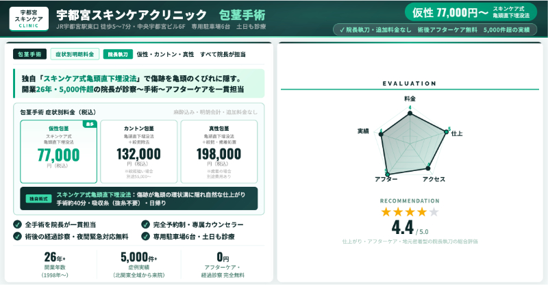 | 宇都宮スキンケアクリニック | 仮性 77,000円/カントン 132,000円/真性 198,000円(+麻酔 33,000円) | 切らない治療なし | 仮性なら総額11万円前後が一つの目安。 |