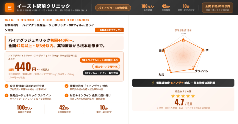 イースト駅前クリニック累計400万人以上の治療実績(ED・AGA中心)男性専門クリニックとして全国展開し、ED外来の症例が豊富