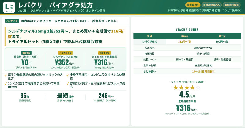 バイアグラジェネリックをとにかく安く通販で入手したい方には、診察料0円で1錠352円から購入できるレバクリが最安級です。