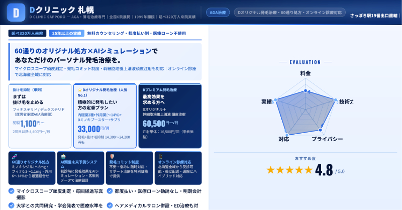 | Dクリニック札幌 | 薄毛専門病院のパイオニアとしての信頼感、多角的な治療提案が受けられる |