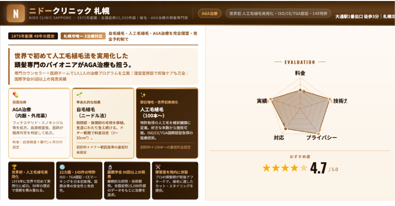 聖心毛髪再生外来 札幌院は「丁寧なカウンセリングとプライバシー配慮」が特徴として挙げられており、安心感を求める方に向いています。