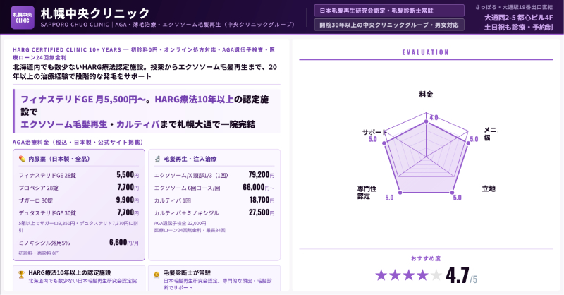 | 札幌中央クリニック | AGA・薄毛治療に特化したサイトと、症例写真・エクソソーム治療の充実 |