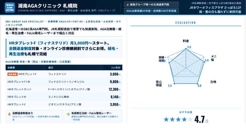 | 湘南AGAクリニック札幌院 | 大手グループの安心感と、JRタワー直結の通いやすさ、自毛植毛まで一貫して相談できる点 |