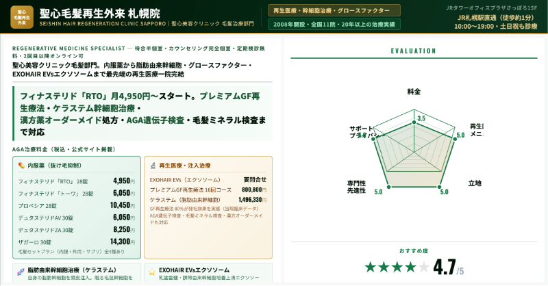 | 聖心毛髪再生外来 札幌院 | 要確認 | フィナステリド4,950〜9,500円/月程度との記載あり | 再生医療・注入療法は別途高額 |