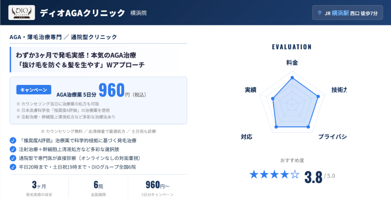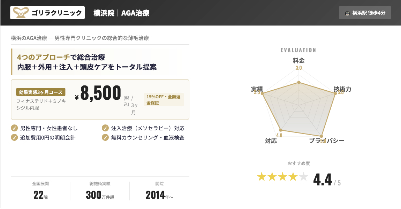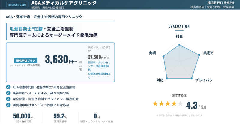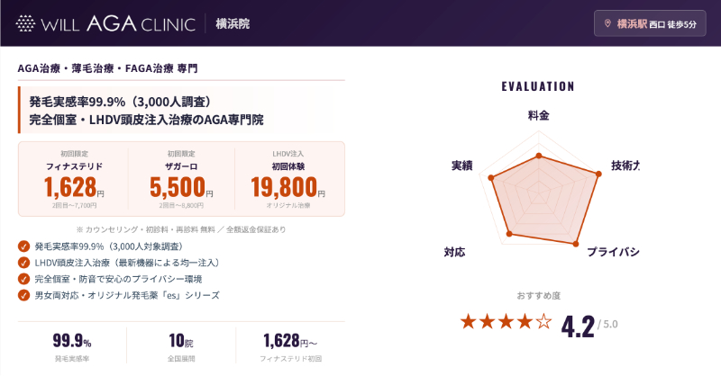 当サイトの独自アンケート(想定100人)でも、横浜エリアのAGAクリニックの中で約2割がこの横浜院を選んでおり、「アクセスの良さ」「発毛に特化した治療プラン」「夜遅くまで開いている安心感」が選ばれた理由として挙がりました。