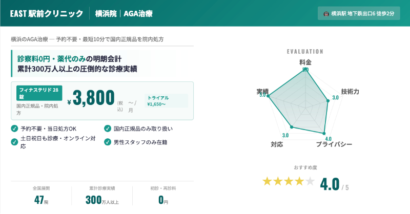 | イースト駅前クリニック 横浜院 | AGA治療薬の専門外来として、全国展開チェーンの一院 | 国内正規の内服薬・外用薬によるシンプルな薬物治療。 |