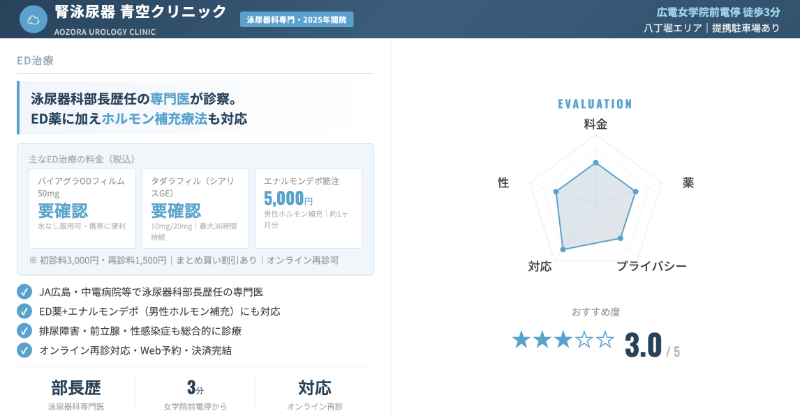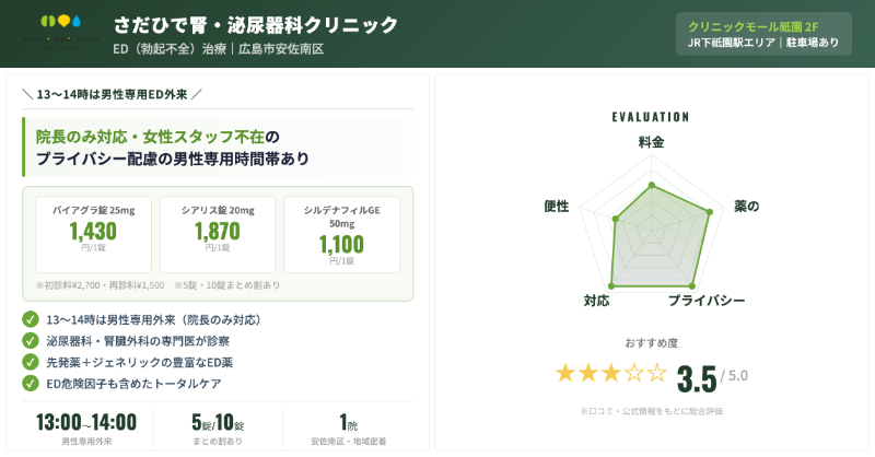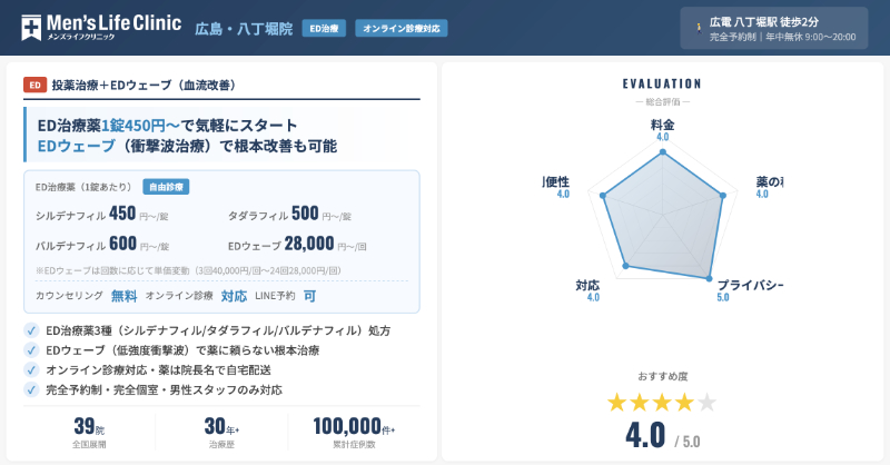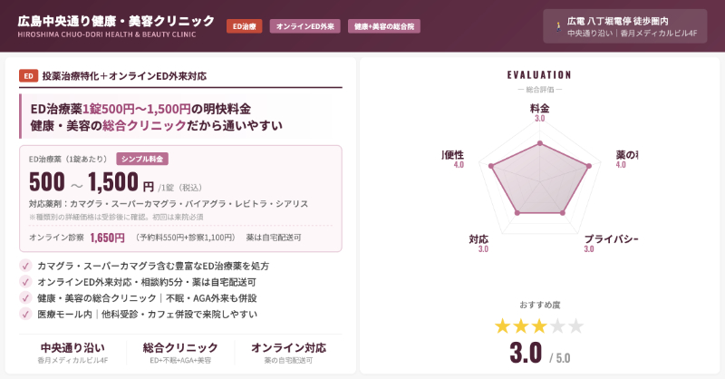 広島駅周辺はED専門クリニックが集中していて、駅近・夜間診療・オンライン診療など「スピード重視」の人に向いています。