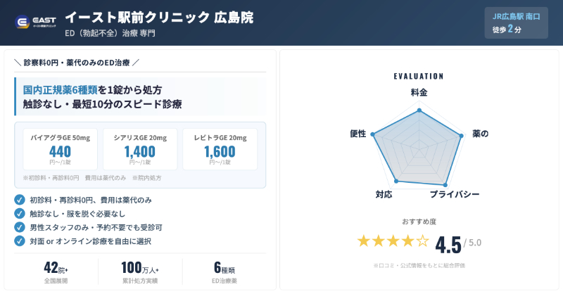 | イースト駅前クリニック 広島院 | 全国展開・開院15年以上・累計300万人以上の診療実績。ED治療薬3種+ジェネリックを多数取り扱い。 | ED治療に特化した大手クリニックで、標準的な治療を受けたい人 |