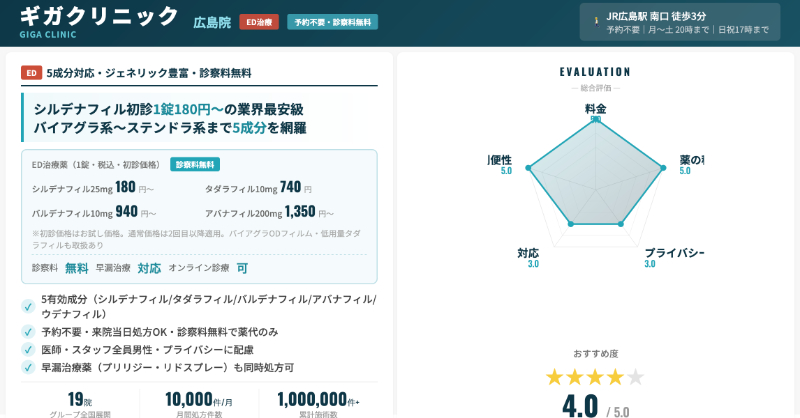 広島ギガクリニック 広島院は、ED治療・早漏治療・AGA治療に特化した男性向けクリニックグループの一院で、多種類のED治療薬を扱い、診察料0円で薬代のみという「EDに特化した運用」をしています。
