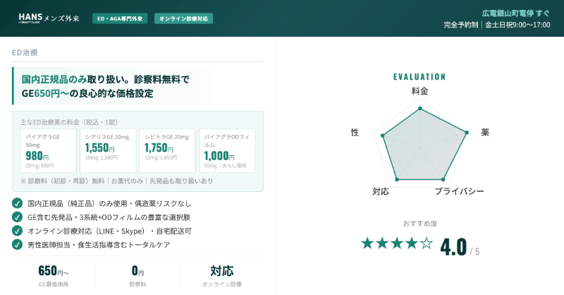 | ハンスメディカルクリニック メンズ外来 | スマホ診察で来院不要のED治療外来。 | 完全予約制・男性医師でプライバシー重視 | 診察料0円で、お薬代のみ負担 |