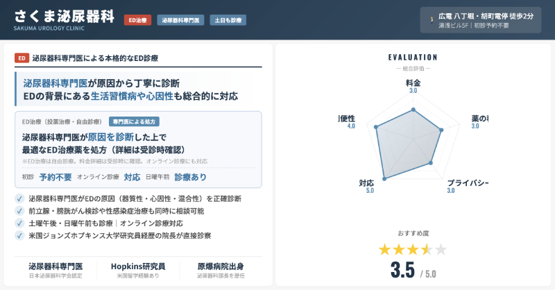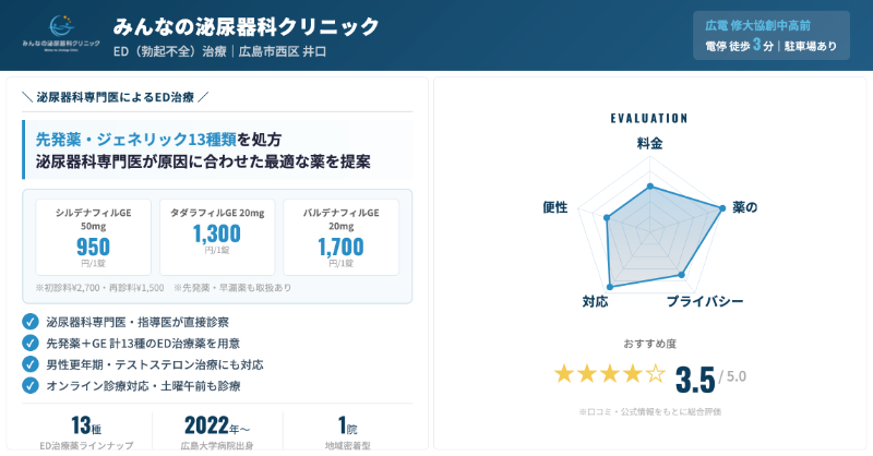 広島のED治療では、比較サイトなどでもイースト駅前クリニック 広島院やみんなの泌尿器科クリニックが複数取り上げられており、治療内容や通いやすさについて解説されています。