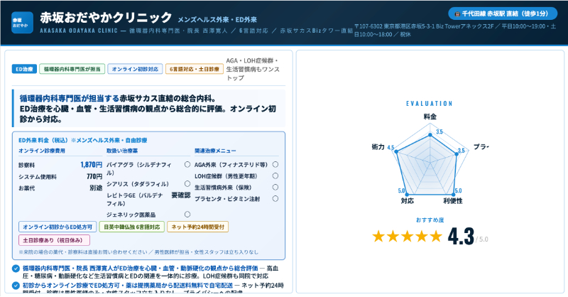 赤坂おだやかクリニックAGA・EDなど男性自費診療に対応し、オンライン診療も強化ED治療薬処方(対面+オンライン)