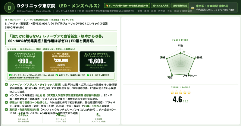 根本治療や検査も含めた総合的なメンズヘルスを考えるなら、Dクリニック東京のように診察料込みでも治療の選択肢が多い院を検討すると良いでしょう。