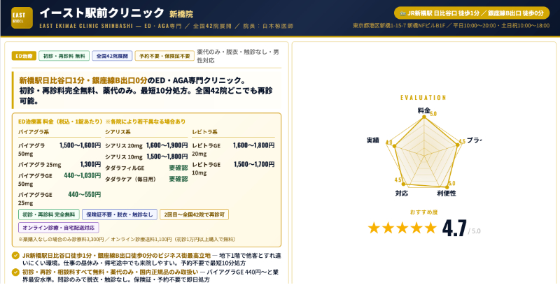 イースト駅前クリニック 新橋院関東〜全国に展開するED・AGA専門チェーンの一院ED治療薬(先発・ジェネリック)処方