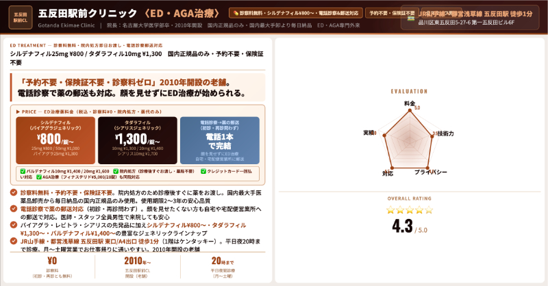 五反田駅前クリニック診察料0円先発50mg 1,500円、ジェネリック50mg 1,000円/錠男性スタッフのみ・薬代のみの明朗会計