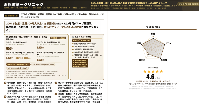 実績重視で選ぶなら、メンズヘルスに特化し、ED治療薬以外の選択肢も持つDクリニック東京が有力です。