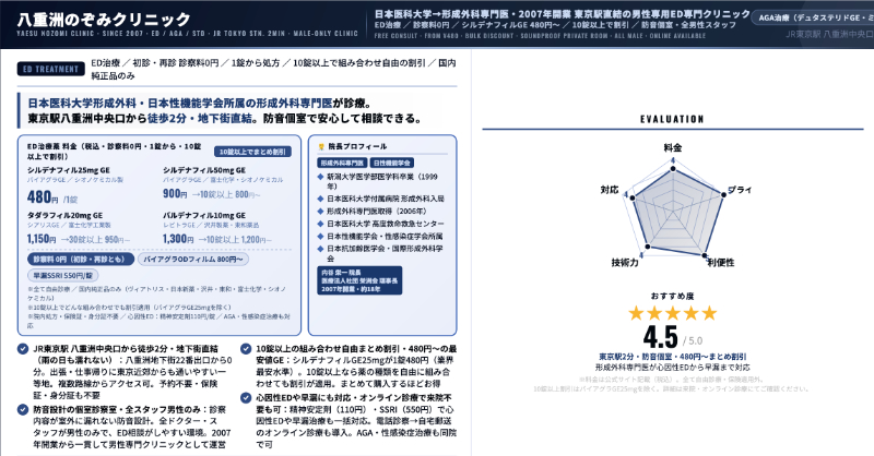 八重洲のぞみクリニック診察料0円バイアグラOD50mg 約1,000円〜、ジェネリック50mg 700〜900円台/錠東京駅近くで正規品中心の価格設定