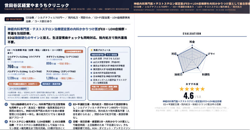 世田谷区経堂やまうちクリニック男性更年期外来の一環としてED・早漏治療を実施ED治療薬・配合剤処方、男性ホルモンとの関連評価